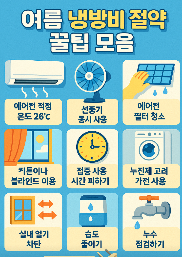 지금까지 소개한 절약법을 일상에 적용하면, 여름철 전기세를 크게 절약할 수 있습니다. 특히 에어컨 설정 온도, 공기 순환, 누진세 관리만 잘해도 체감 전기세는 확연히 줄어듭니다. 효율적인 냉방으로 더운 여름, 시원하고 똑똑하게 보내세요! 😄